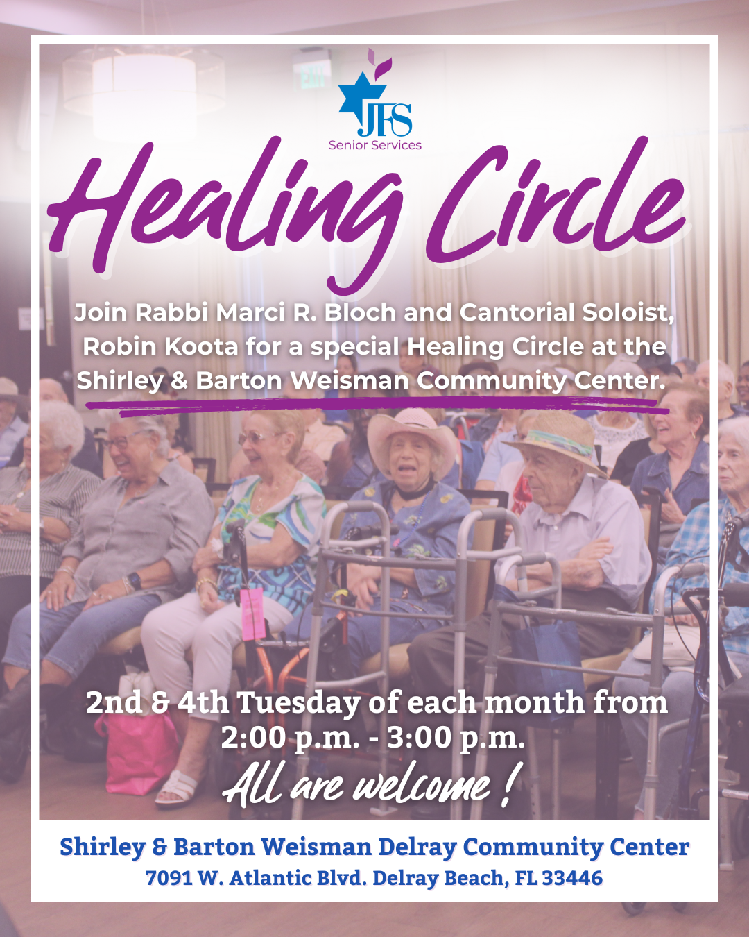 Join Rabbi Marci R. Bloch and Cantorial Soloist, Robin Koota for a special Healing Circle at the Shirley & Barton Weisman Community Center. This will provide a sacred space for those experiencing grief, loss, or seeking comfort amidst life's challenges. Through song, prayerful readings, poetry, and compassionate community, we come together to find solace, renewal, and hope. The Healing Circle meets the 2nd & 4th Tuesday of each month from 2:00 p.m. - 3:00 p.m. All are welcome (members & non-members).