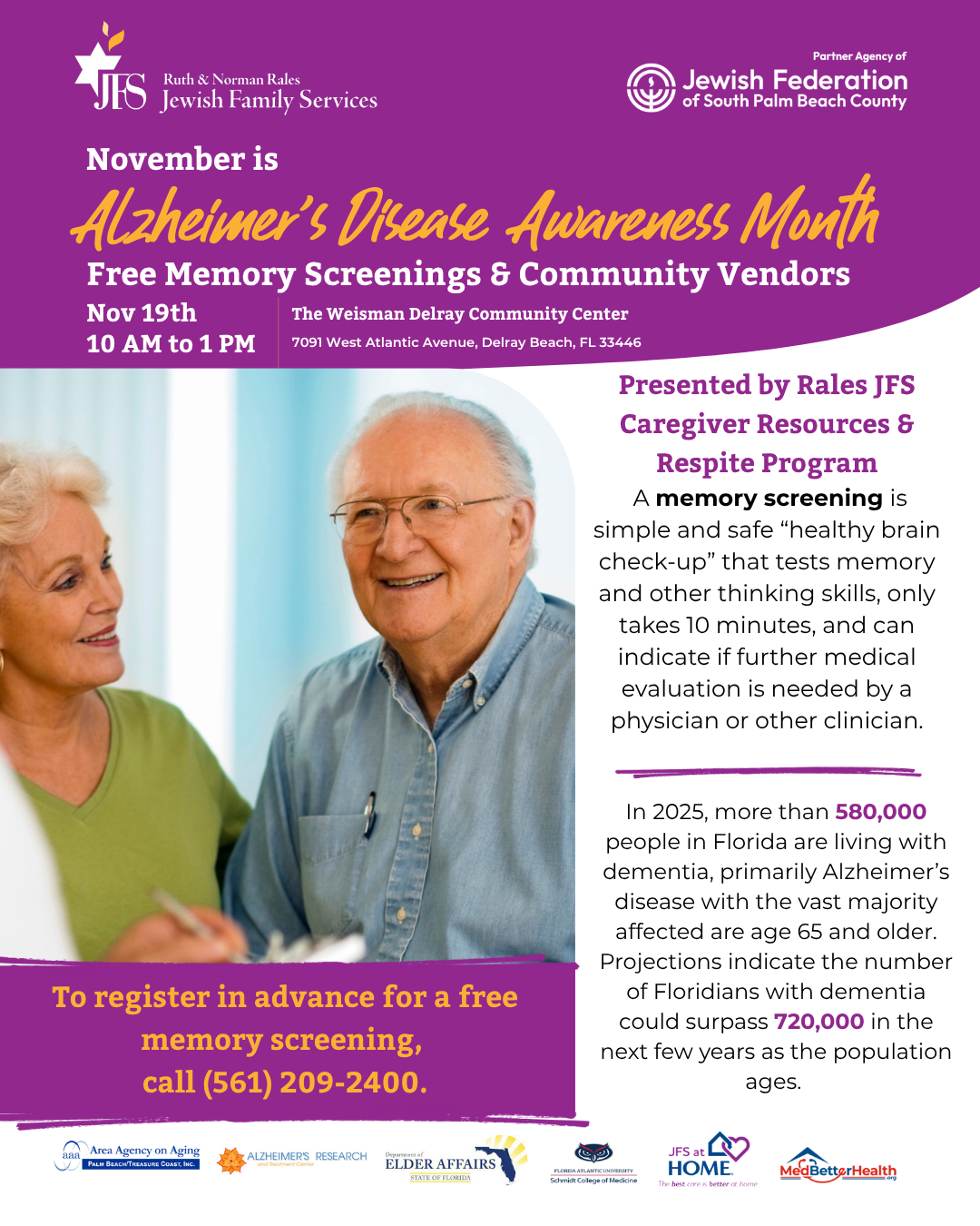 This month is Alzheimer's Awareness Month, and in recognition, on November 19th, Rales JFS will conduct free memory screenings, helping attendees learn lots of valuable information from vendors at The Weisman Delray Community Center.